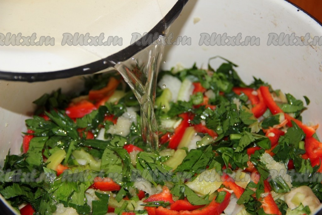 В отдельной ёмкости соединить все составляющие маринада: растительное масло, уксус, сахар и соль, тщательно перемешать, а затем влить в кастрюлю с овощами и зеленью.