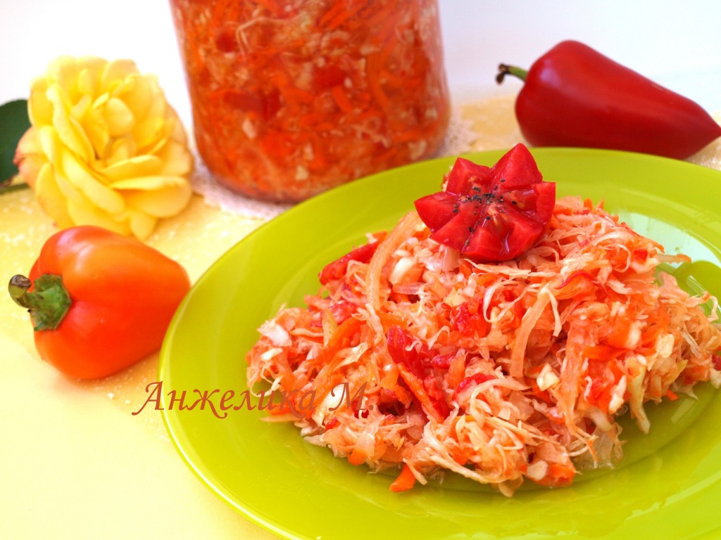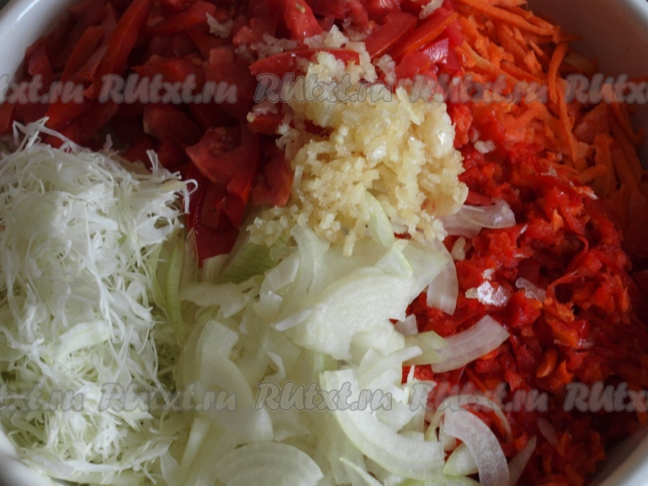 Капусту, морковь, лук, чеснок, морковь и болгарский перец соединяем и перемемешиваем, добавляем соль, сахар, уксус и растительное масло, снова хорошо перемешиваем.