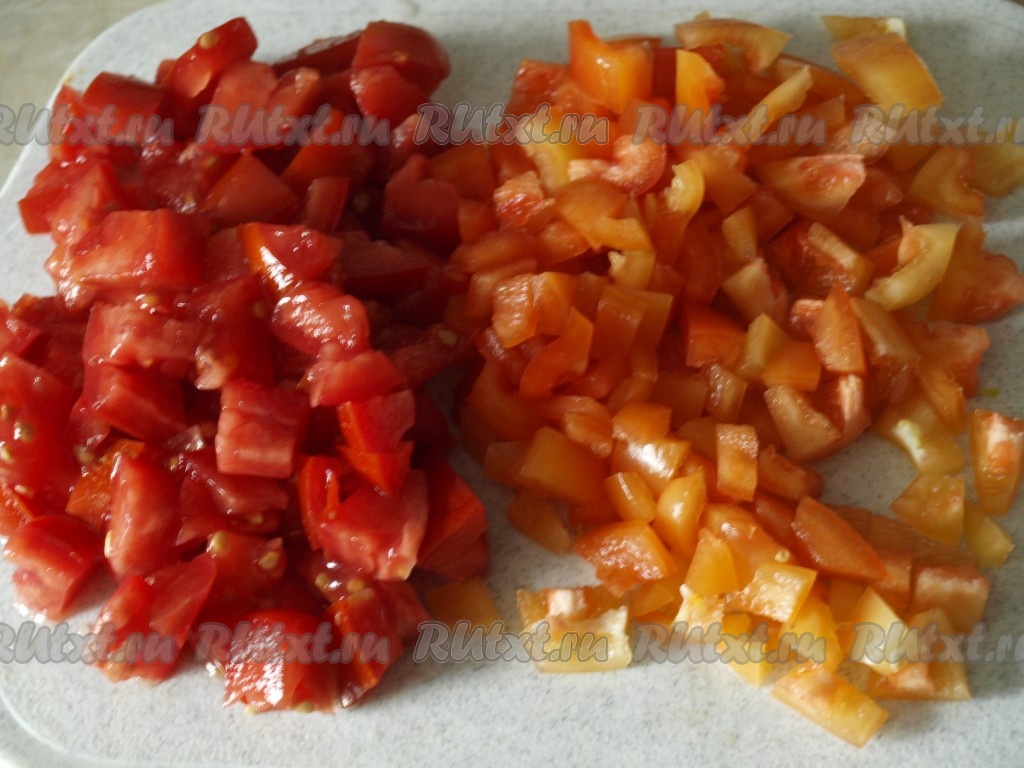 Болгарский перец и помидоры нарезаем некрупными кусочками или соломкой.