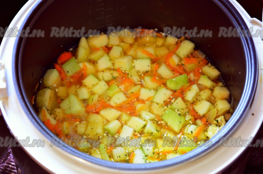 Почистить кабачок и картофель от кожуры. Если у кабачка крупные семечки, их нужно удалить. Картошку и кабачок нарезать кубиками и выложить их в мультиварку к луку и мокрови. Залить бульоном (или водой), посолить, добавить специи, закрыть крышку и готовить в течение 20 минут в режиме "Суп".