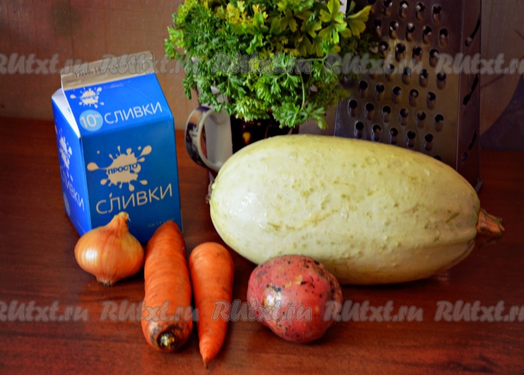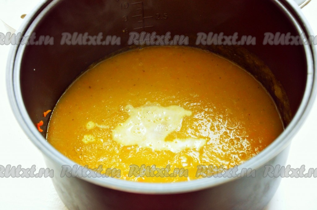 Готовый овощной суп пюрировать с помощью погружного блендера. В это время разогреть сливки и вылить их в наш кабачковый суп-пюре, закрыть к рышку мультиварки и готовить в течение 10 минут в режиме "Суп".