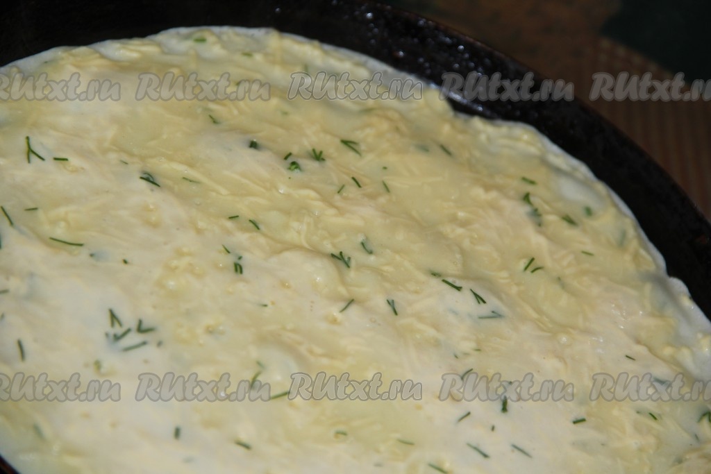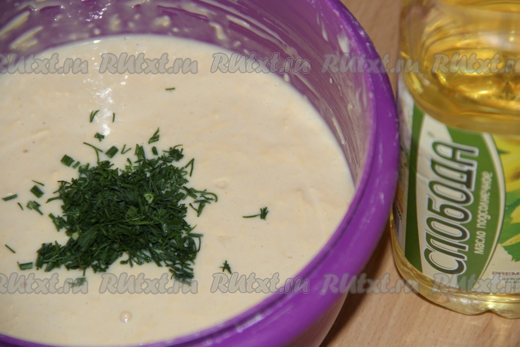 Сыр добавляем в тесто, перемешиваем. Мелко нарезанный укроп и растительное масло добавляем в тесто и ещё раз хорошо перемешиваем. Блинное тесто получается достаточно жидким.