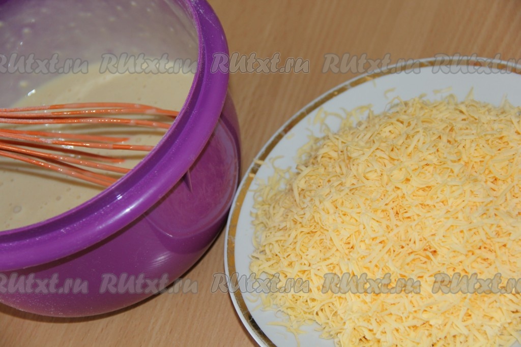 Перемешиваем тесто венчиком до однородной консистенции. Натираем сыр на мелкой тёрке.