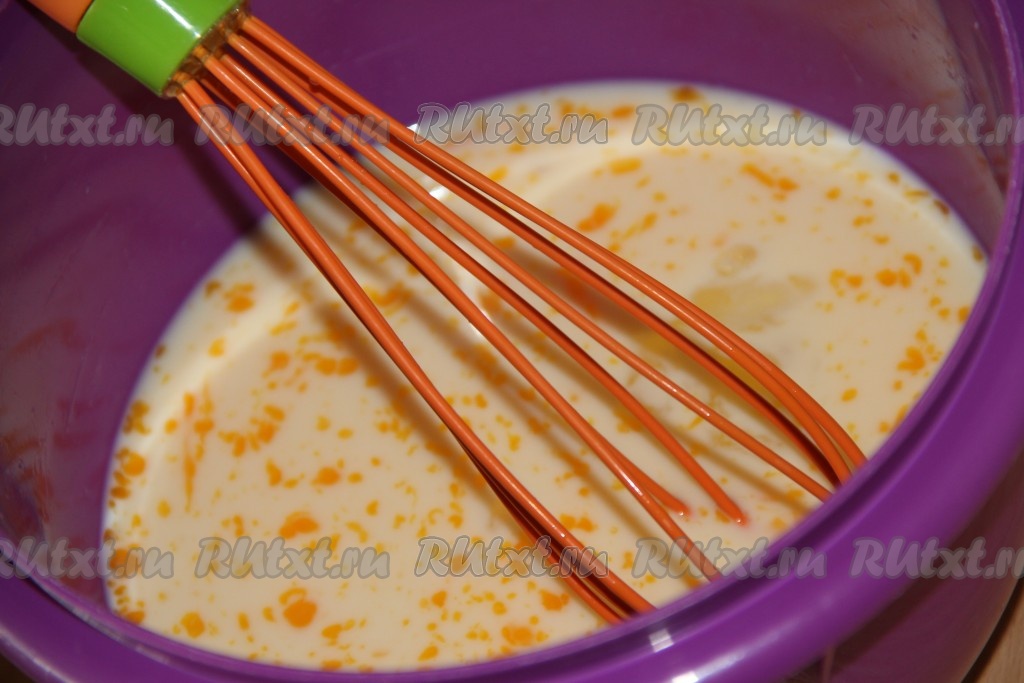 Укроп промываем водой и обсушиваем. Соединяем в глубокой миске яйца, молоко, соль, сахар и слегка взбиваем венчиком.