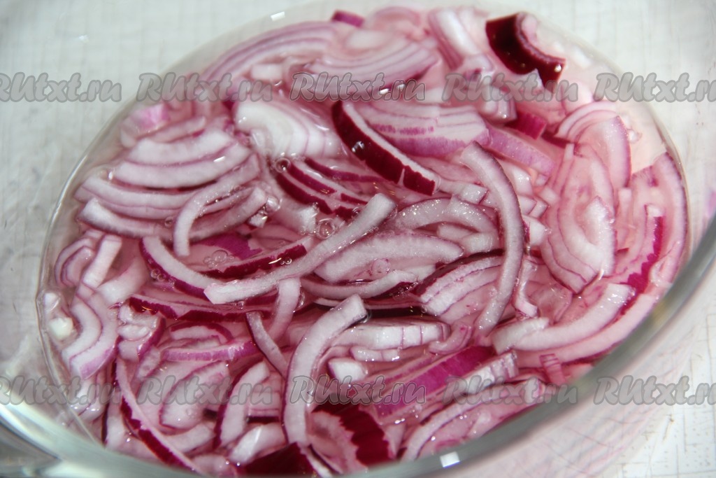 Лук почистить, нарезать полукольцами. Для приготовления маринада соединить уксус, сахар, воду, перемешать. Получившимся маринадом залить лук и оставить на 25-30 минут. По истечении времени лук откинуть на дуршлаг, чтобы избавиться от лишней жидкости.