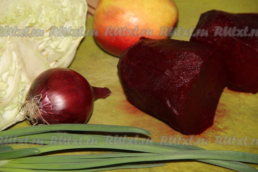 При подаче салат с капустой, свеклой и яблоком посыпать порезанным зелёным луком.