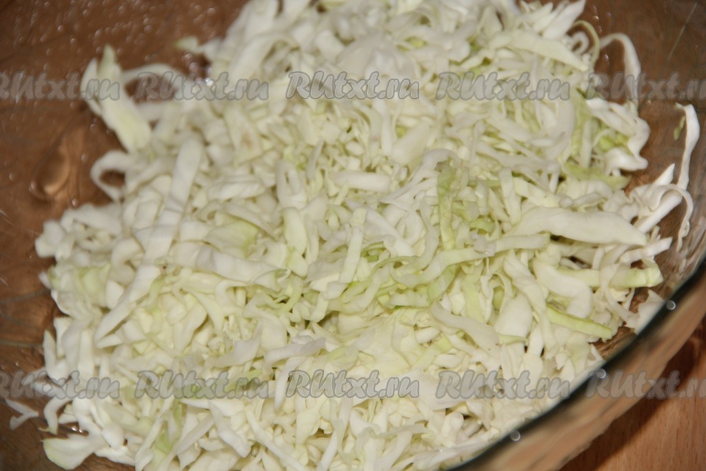 Капусту тонко нашинковать, посолить и помять немного руками.