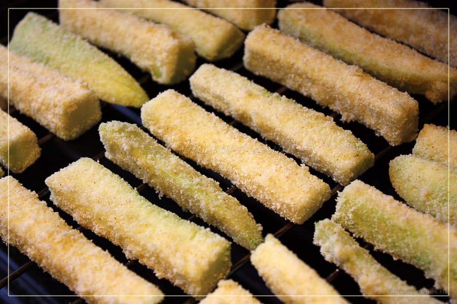 Запекаем кабачки в разогретой духовке на противне или прямо на решетке 20-30 минут при температуре 180 градусов до золотистой корочки (можно в конце приготовления включить гриль на 3-5 минут). Кабачки, запеченные в панировке, подаём со сметаной или соусом.