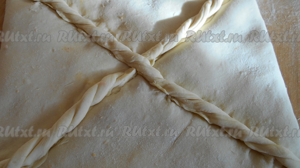 Слоёное тесто заранее разморозить. Тесто на присыпанной мукой поверхности раскатать в квадратный пласт толщиной 2 миллиметра, в центр выложить начинку из фарша и тыквы.