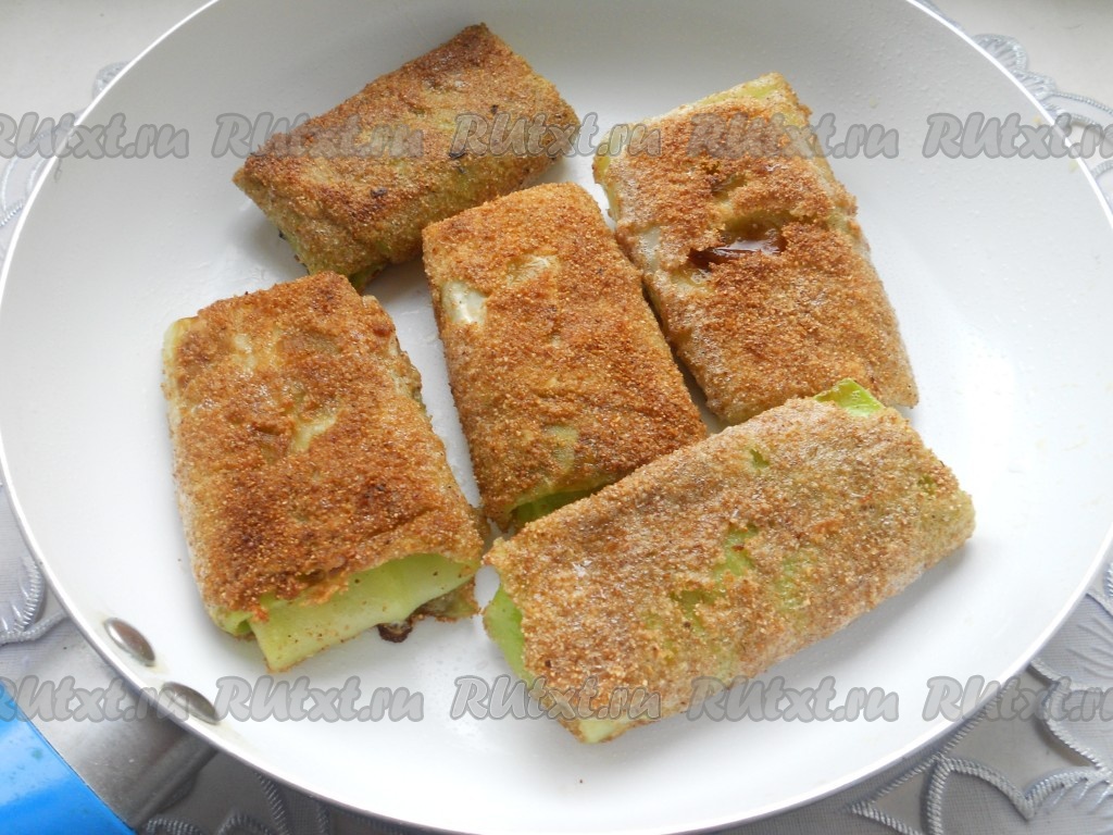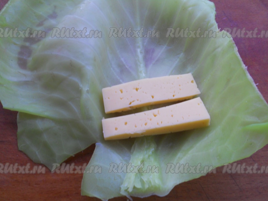 Утолщенную часть капустных листьев отбить молоточком. Поместить по 2 кусочка твердого сыра, порезанного брусочками.