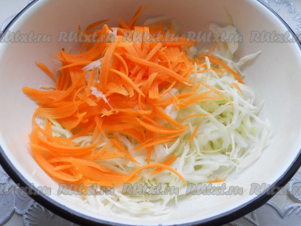 Капусту тонко нашинковать. Добавить пару щепоток соли, хорошо помять капусту руками. Добавить морковь, натертую на терке для корейской моркови.