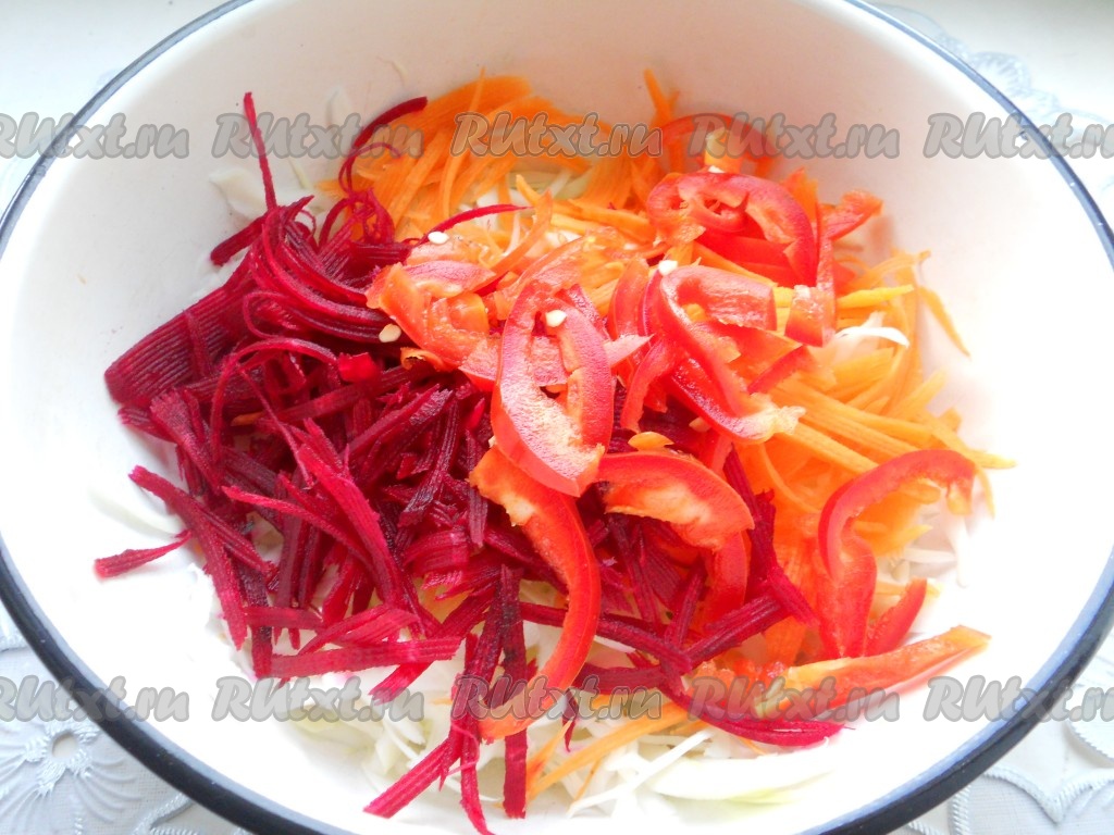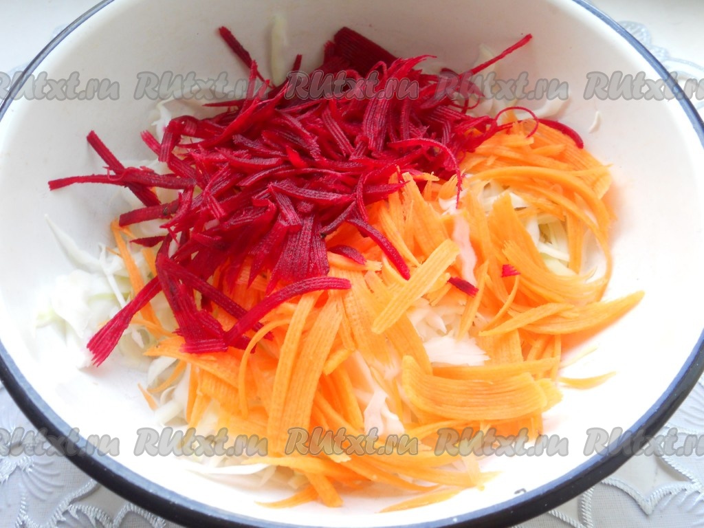 Также натереть и свеклу, добавить в салат к капусте и моркови.