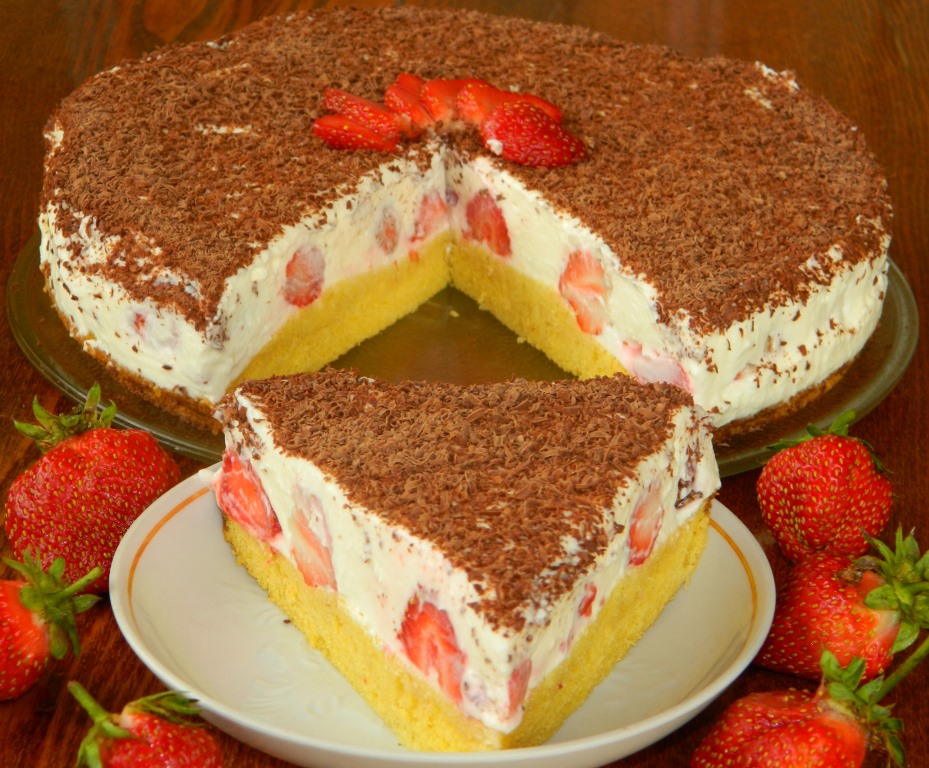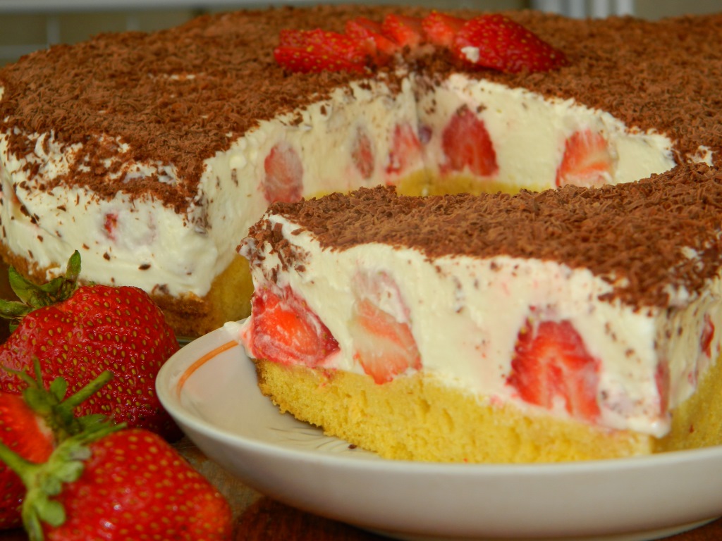 Очень вкусный, лёгкий торт с творожным сыром и сливками! Он получается таким нежным и воздушным, что рука сама тянется за вторым кусочком этого лакомства, а дополнение начинки клубникой делает вкус изысканным и очень украшает тортик. В разрезе этот десерт смотрится изумительно. Обязательно побалуйте себя этим тортом!
