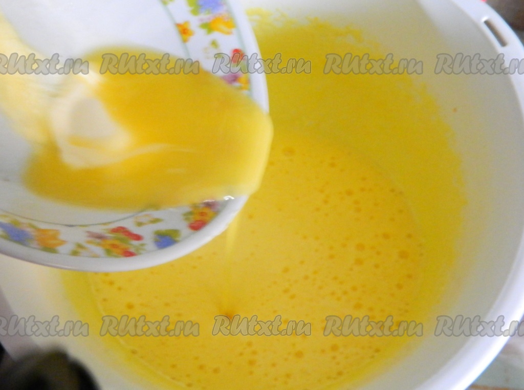 В яично-сахарную массу добавляем растопленный маргарин.