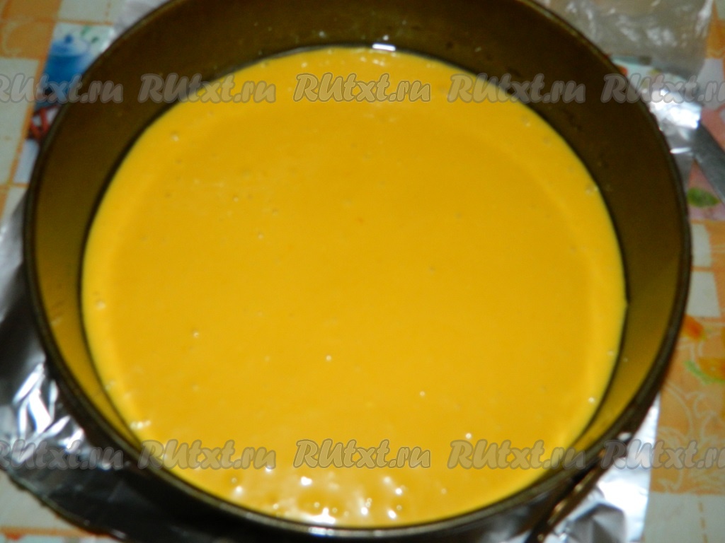 Добавляем муку и соду. В разъёмную форму (у меня диаметр формы 24 см), смазанную маслом, выливаем приготовленное тесто и отправляем в разогретую духовку при температуре 180 градусов на 15-20 минут.