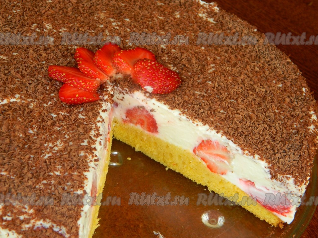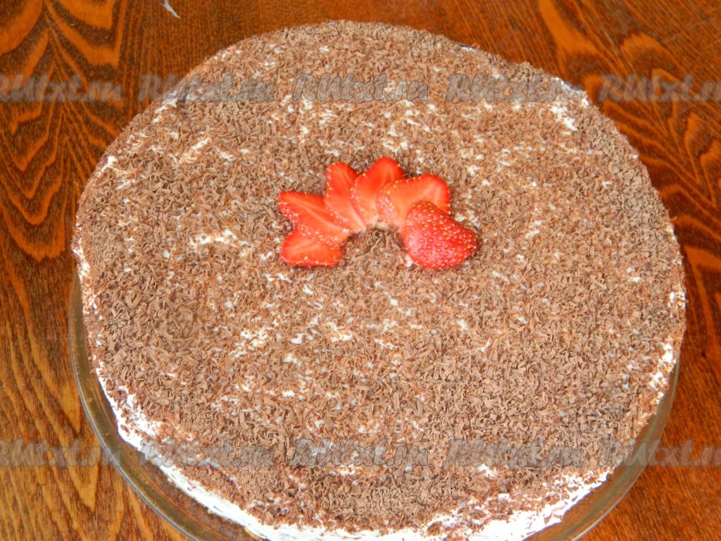 Украшаем торт с клубникой тертым шоколадом. Аккуратно проведя ножом между кремом и формой, снимаем форму. Убираем торт в холодильник для застывания.
