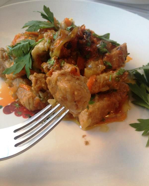 На мясо выкладываем лук с морковью, добавляем перец горошком, лавровый лист, специи, заливаем маринадом (100 мл маринада надо оставить для хлеба), накрываем крышкой, ставим на огнь, после закипания огонь убавляем и готовим минут 30.