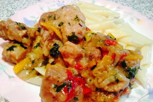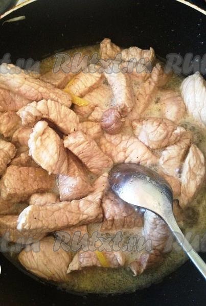 Свинину, порезанную на небольшие куски, заливаем бальзамическим уксусом и пивом, добавляем цедру лимона и оставляем на 2 часа, чтобы мясо промариновалось.
