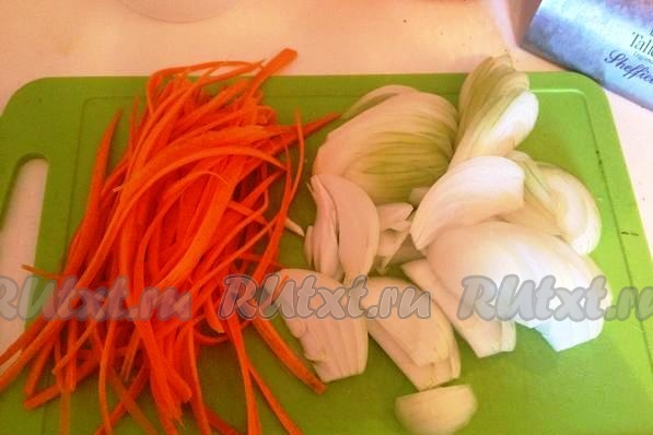 Лук режем тонкими дольками, морковь нарезаем соломкой.