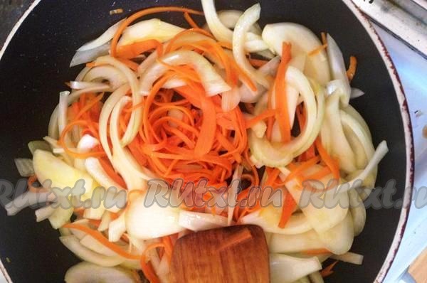На разогретую сковороду с растительным маслом выкладываем морковь, немного обжариваем, выкладываем лук, перемешиваем, накрываем крышкой и тушим на маленьком огне 10 минут.