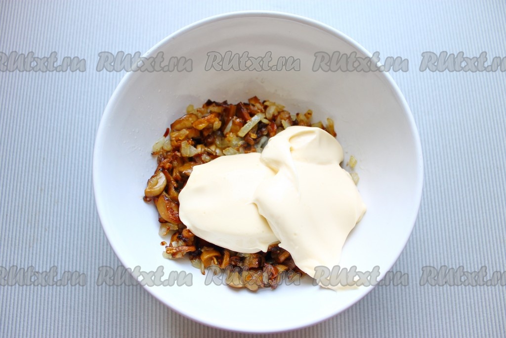 Для приготовления начинки нужно нарезать шампиньоны и очищенную луковицу, затем выложить на сковороду, разогретую с растительным маслом, обжарить, помешивая, на среднем огне до золотистого цвета. Затем дать немного остыть, соединить со сливочным сыром, посолить, поперчить и перемешать.