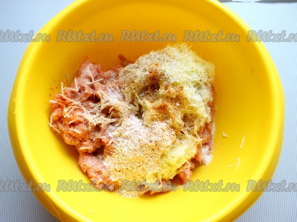 Кабачок (можно заменить, например, на тыкву или патиссон) и чеснок натереть на мелкой тёрке, выложить к фаршу, добавить панировочные сухари, соль, чёрный молотый перец, сахар и тщательно перемешать, при необходимости, добавить чуть воды, чтобы фарш не был слишком крутым.