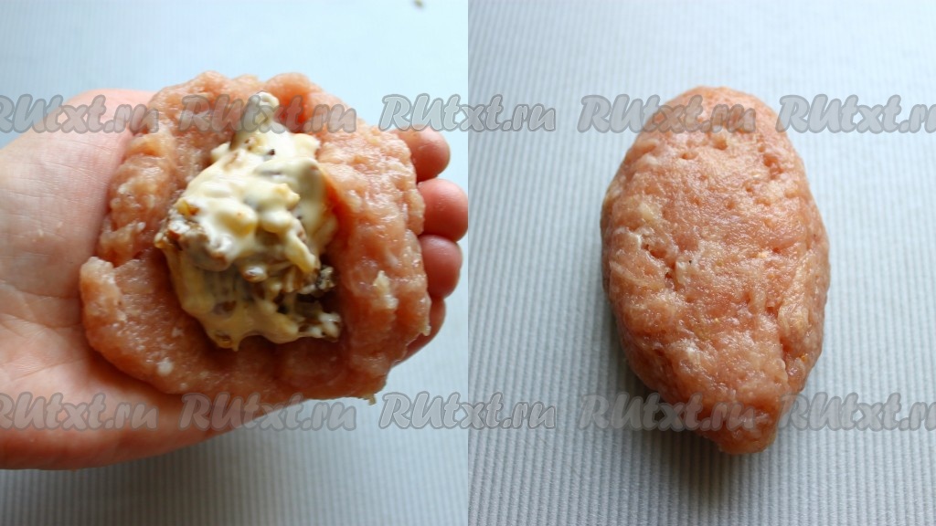 Затем часть фарша взять в руку, сделать лепёшку, на серединку положить 1 чайную ложку начинки из грибов и сыра, залепить края лепёшки, сформировав котлетку. Таким образом сформировать все зразы из фарша с грибами и сыром.