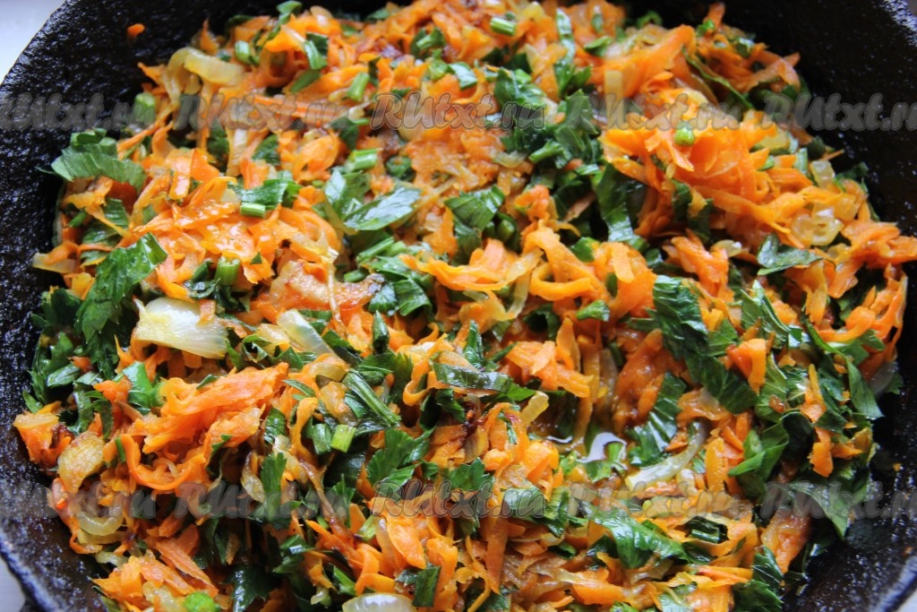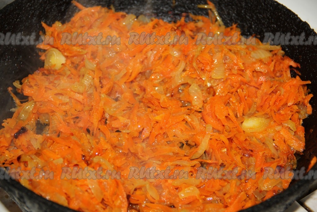 Выливаем в сковороду растительное масло и обжариваем измельчённый лук и натёртую морковь до золотистого цвета на среднем огне, помешивая, затем снимаем с огня и даём остыть.