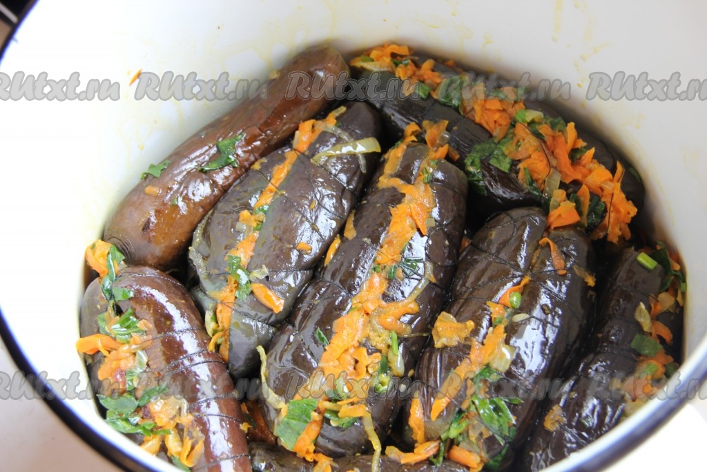 Каждый баклажан фаршируем полученной овощной массой и обматываем ниткой. Плотненько выкладываем баклажаны в миску (или кастрюльку), сверху ставим пресс. Через 2-3 часа масло должно покрыть наши баклажаны полностью. Если этого не произошло, добавьте сверху ещё масла.