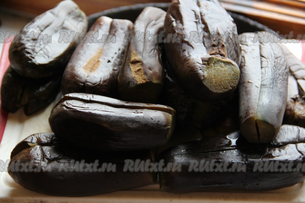 Баклажаны очищаем от хвостиков, разрезаем вдоль по серединке, не дорезая до самого конца. Баклажаны заливаем кипящей водой. Воды наливайте столько, чтобы хватило покрыть баклажаны. Соли добавляйте в воду из расчёта 1 столовая ложка на 1 литр используемой воды. Баклажаны отвариваем, примерно, 10 минут (в зависимости от размеров). Проверяем готовность баклажана спичкой. Если спичка входит с лёгкостью, баклажаны готовы. Ставим баклажаны под пресс, разрезом к верху. Под прессом держим 1-2 часа.