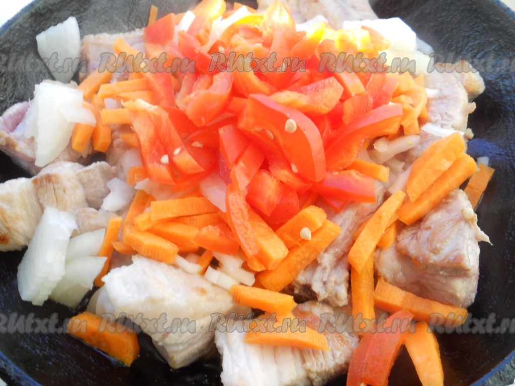 Добавить к мясу морковь, порезанную брусочками, лук, нарезанный небольшими кусочками, и порезанный соломкой сладкий болгарский перец. Обжаривать все вместе минут 5.