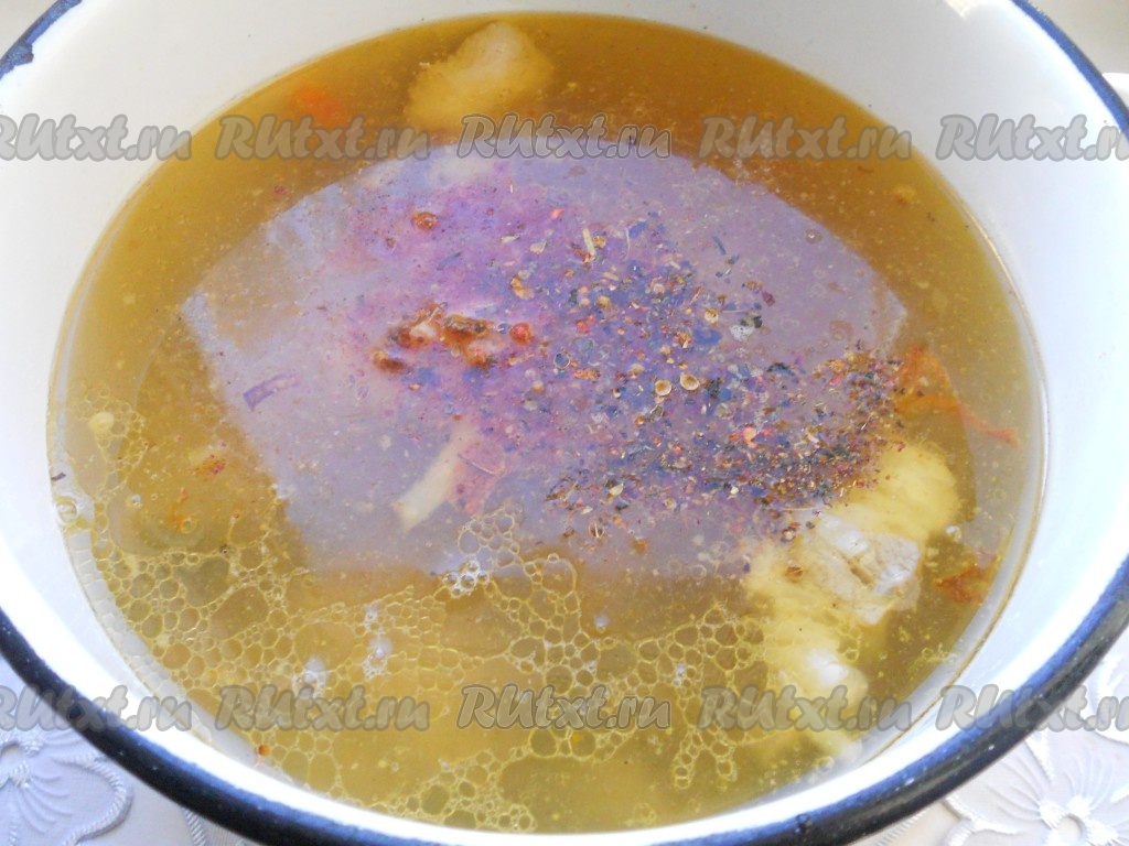 Влить горячую воду, добавить соль и специи.