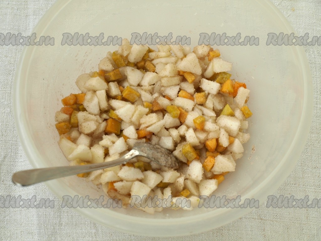 Смешать яблоки и тыкву с сахаром и корицей.