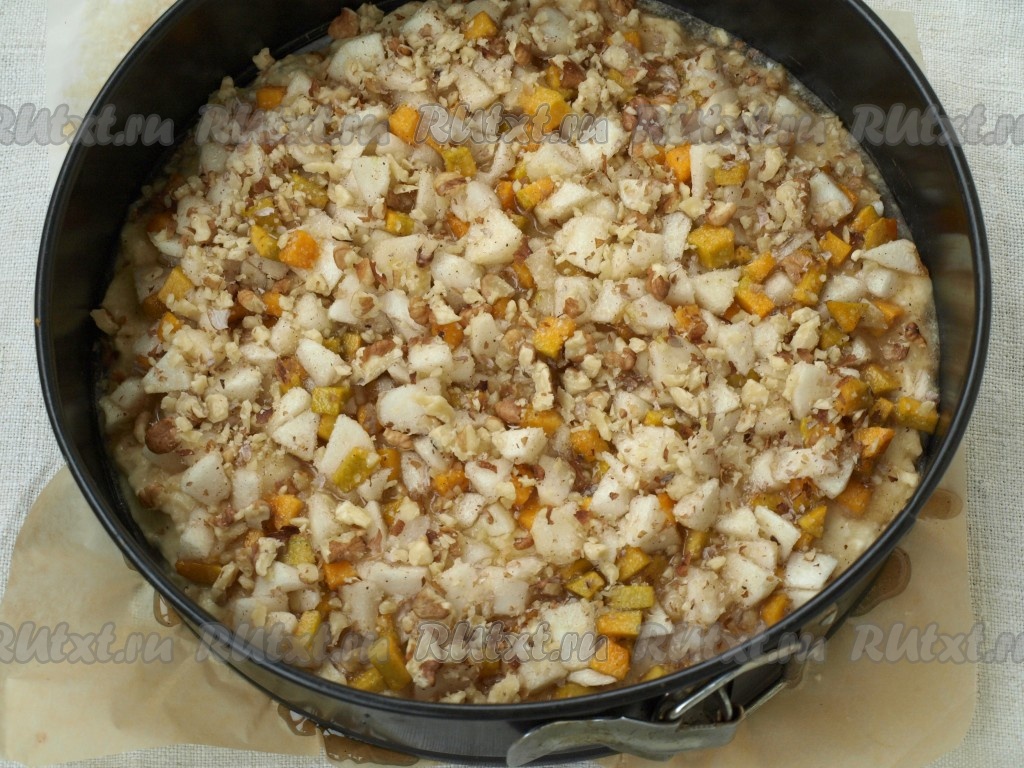 Взять разъёмную форму (у меня диаметром 24 см), застелить пергаментной бумагой. Аккуратно вылить тесто и разровнять. Сверху выложить начинку из яблок и тыквы, посыпать рубленными грецкими орехами.