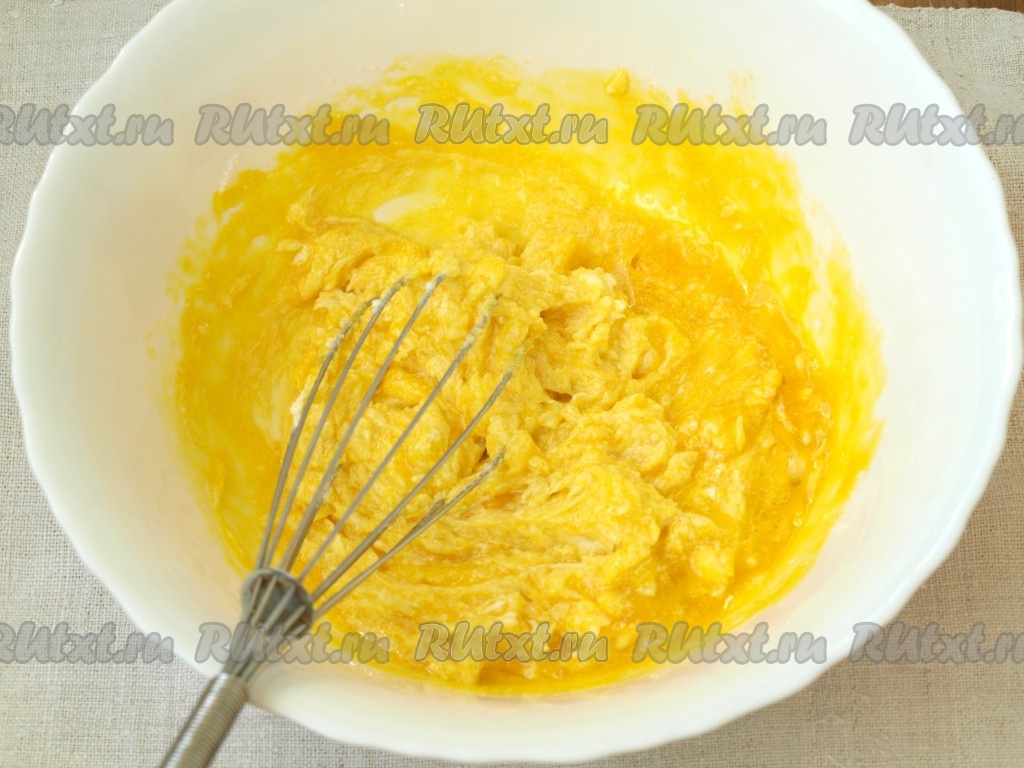 Разделить яйца на белки и желтки. Белки отставить, а желтки смешать с мягким маслом и сахаром. Хорошо взбить массу до однородной консистенции.