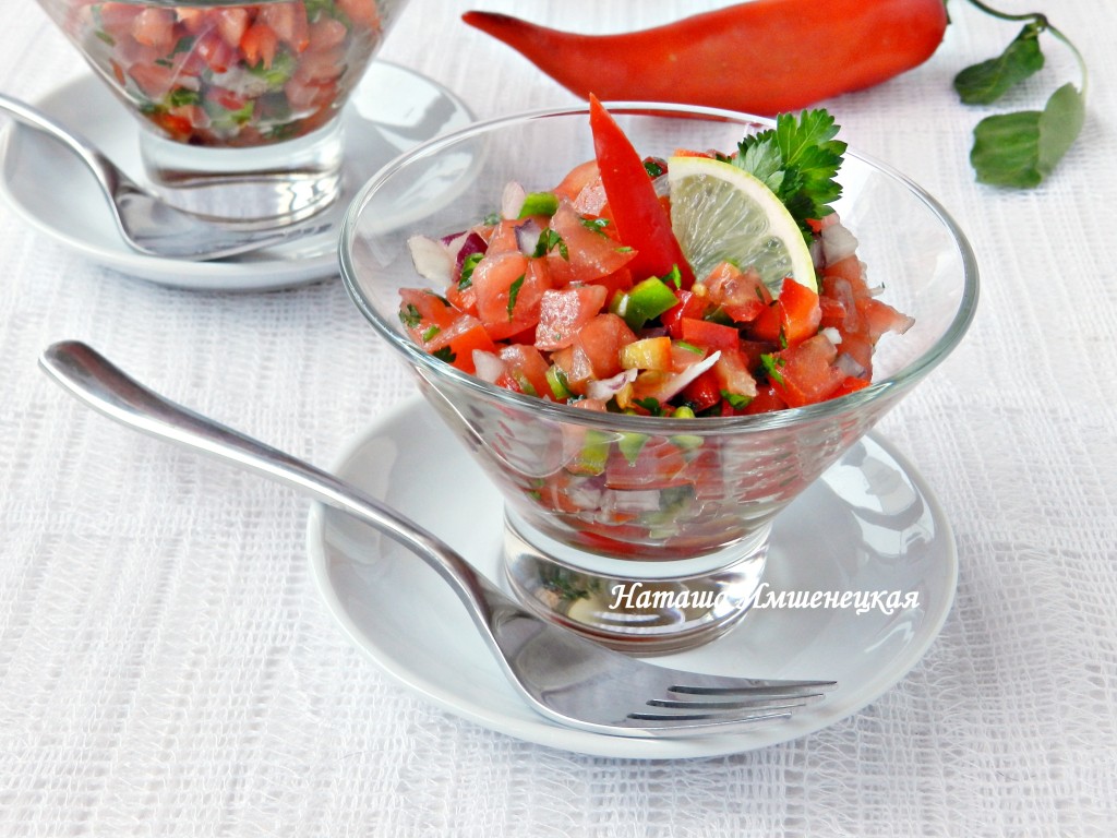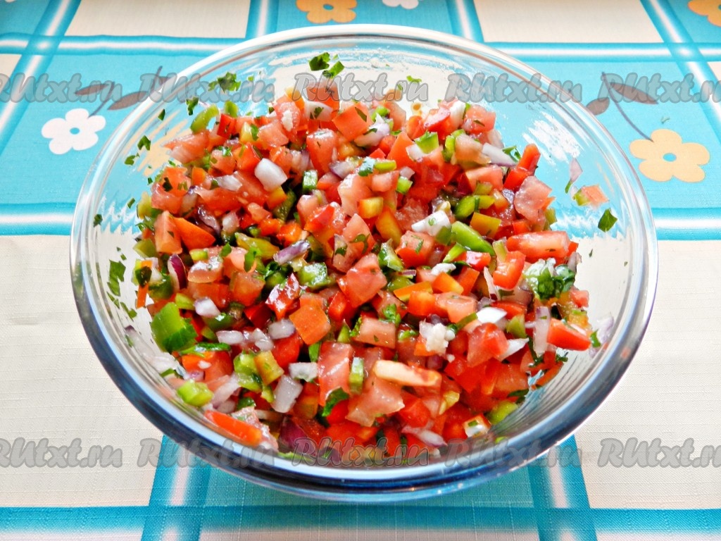 Острый салат из помидоров и перца прекрасно дополнит основное мясное блюдо. Салат получается очень вкусным и сочным. Остроту можно регулировать по своему вкусу.