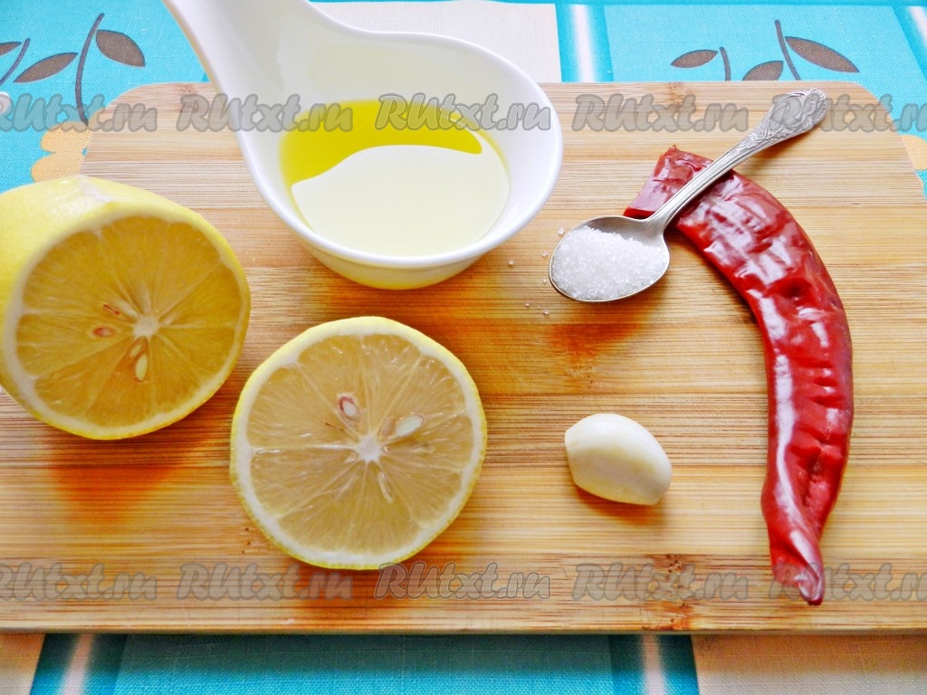 Приготовить заправку для салата. Смешать оливковое масло и лимонный сок, добавить щепотку сахара, пропущенный через пресс чеснок. Острый перец очистить от семян, отрезать от стручка необходимое количество и нарезать полосками.