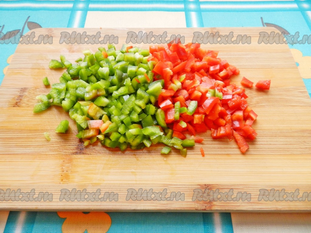 Болгарский перец очистить от семян и перегородок и также нарезать кубиками.