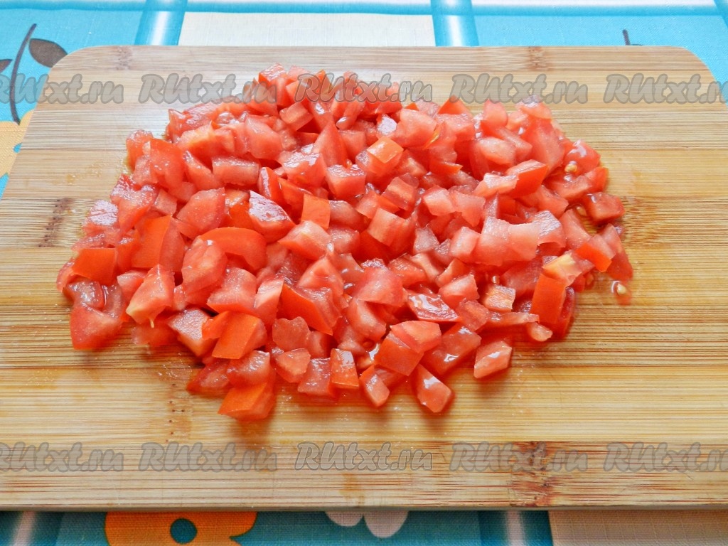 У помидоров удалить семена, мякоть нарезать.