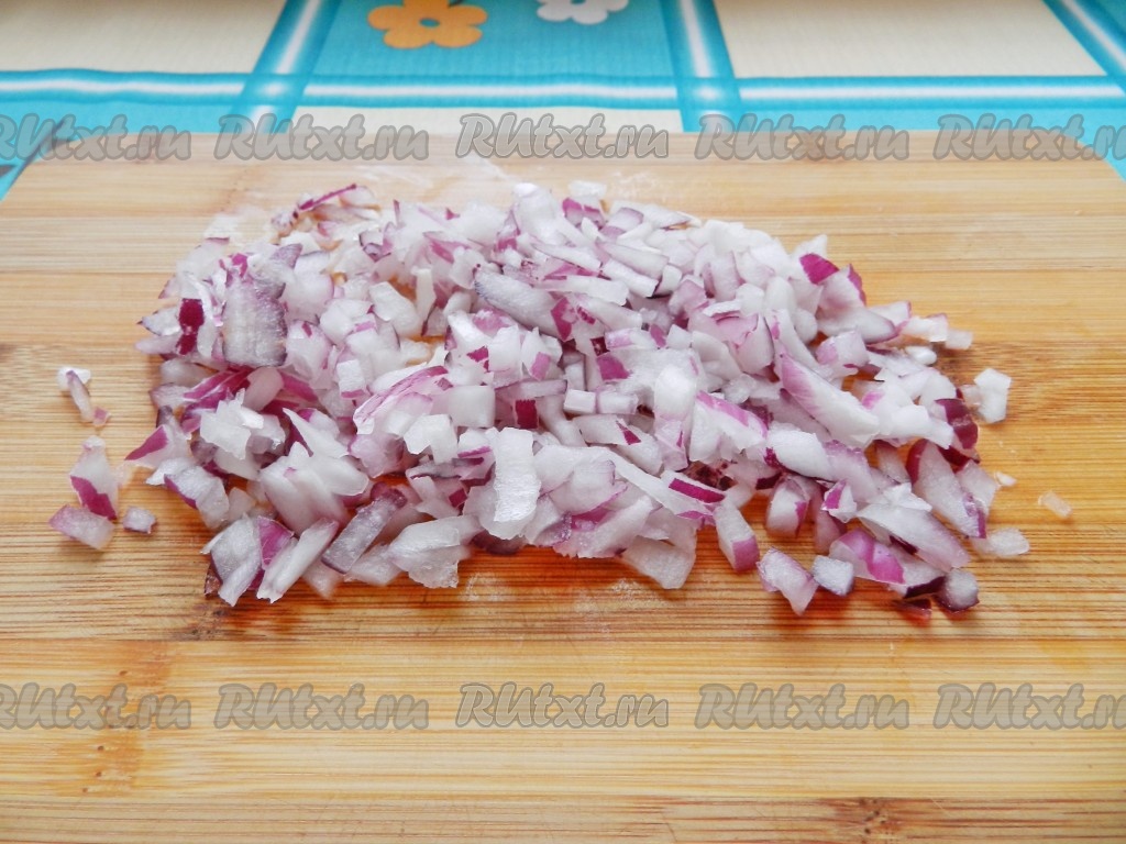 Лук очистить и нарезать мелкими кубиками.