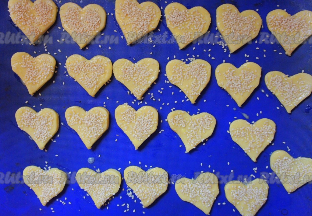 Духовку разогреть до 180 градусов. Противень застелить пекарской бумагой (или силиконовым ковриком), выложить заготовки сырных крекеров. Смазать печенье взбитым яйцом и обильно присыпать кунжутом.