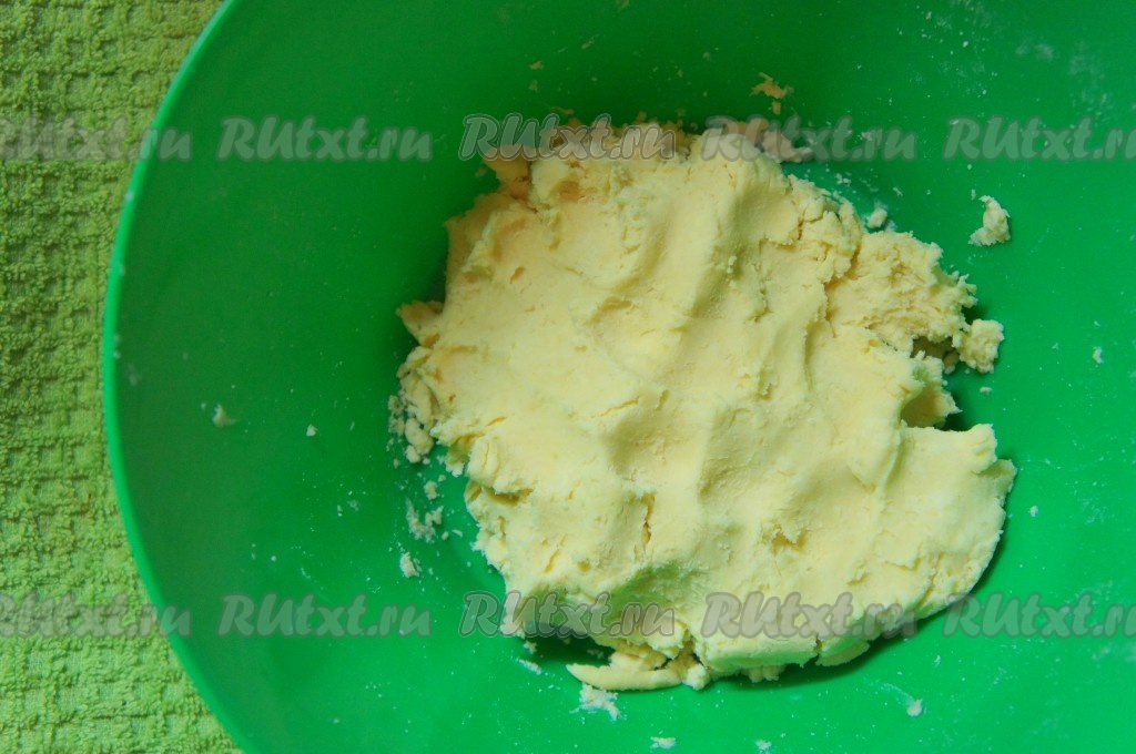 К натёртому маслу добавить соль, сахар, 125 грамм муки, растереть руками содержимое миски до получения крошки. Добавить яйцо, перемешать тесто до однородности.