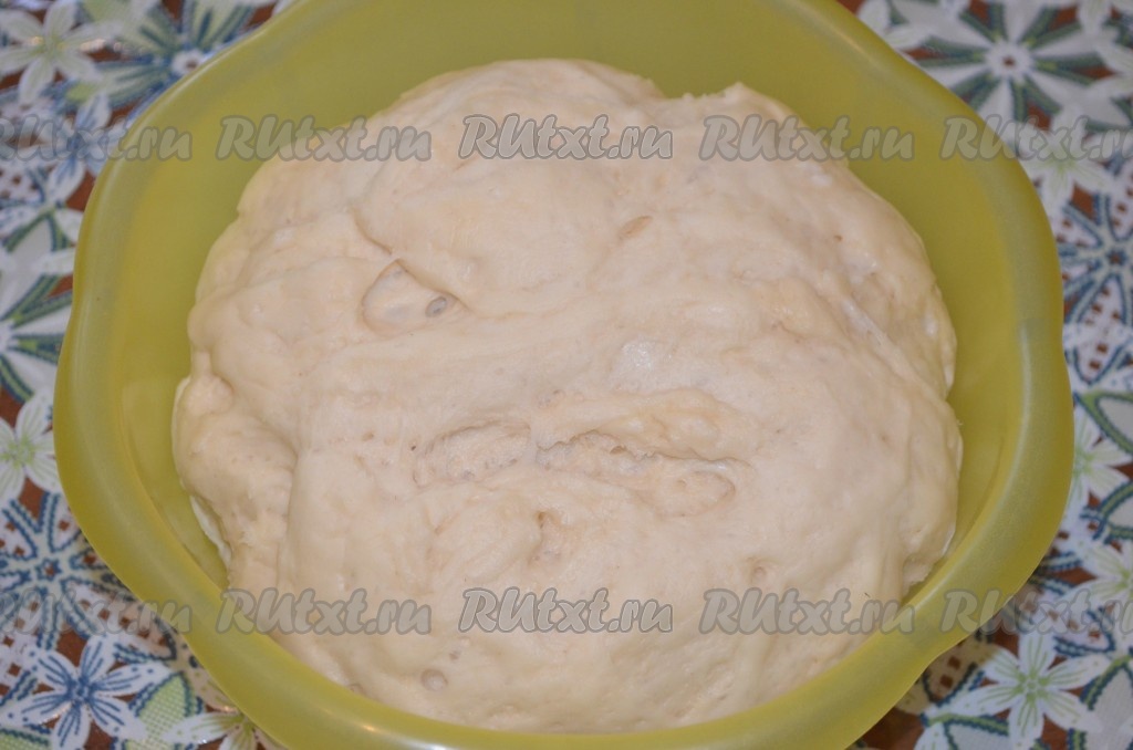 Вот так выглядит подошедшее дрожжевое тесто для наших ватрушек. Выложить его на стол, обмять.