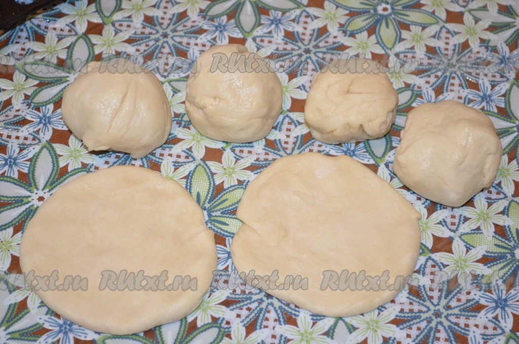 Тесто разделить на одинаковые кусочки. У меня вышло 6 кусочков, то есть я сформировала 6 крупных ватрушек. Можно разделить тесто и на большее количество частей, тогда и ватрушек получится больше, но они будут меньшего размера. Каждый кусочек теста скатать в шарик. Каждый шарик раскатать (или растянуть руками) в круглую лепёшку. Накрыть полотенцем и оставить на 40 минут.