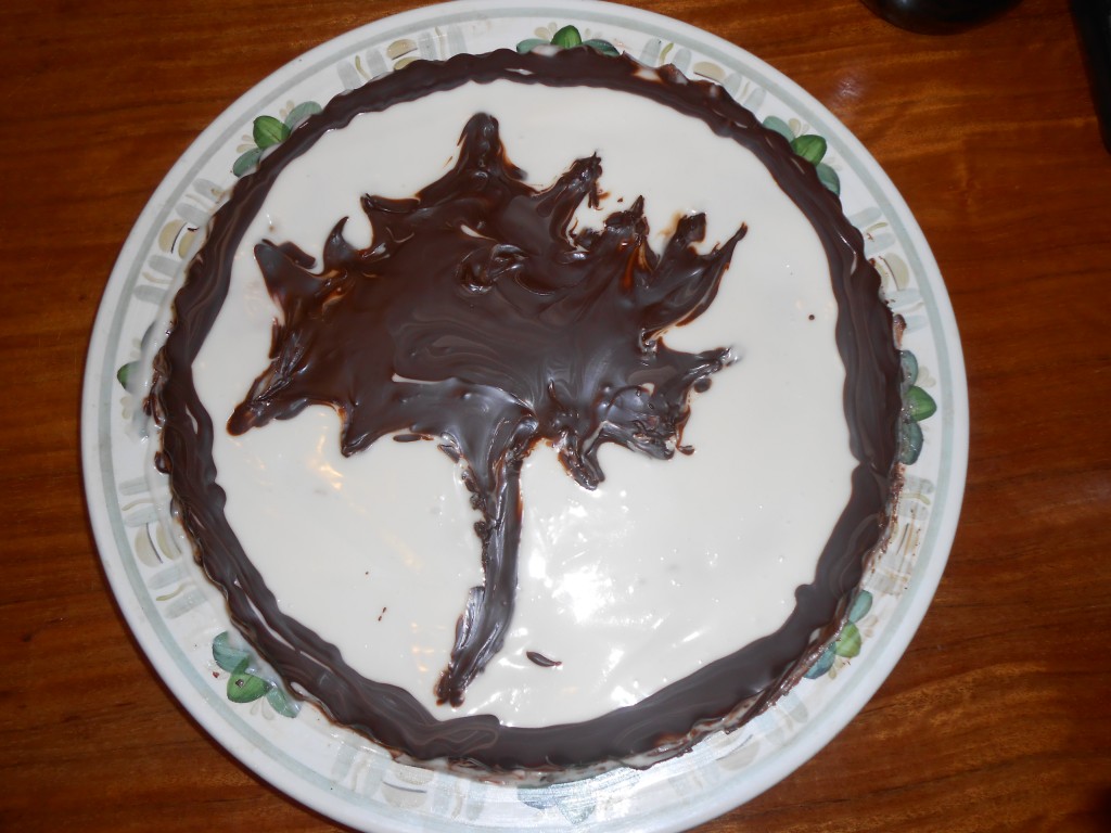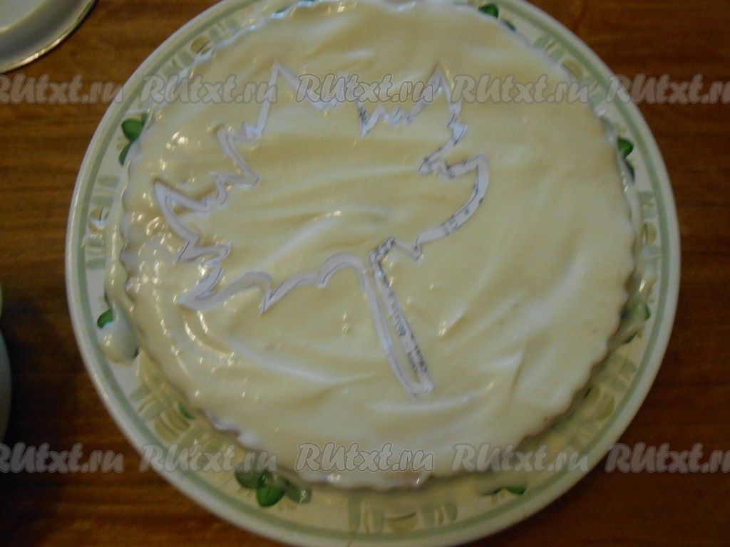 Укладываем кленовый лист на тортик и заливаем глазурью, аккуратно убираем заготовку, поправляем глазурь ножом.