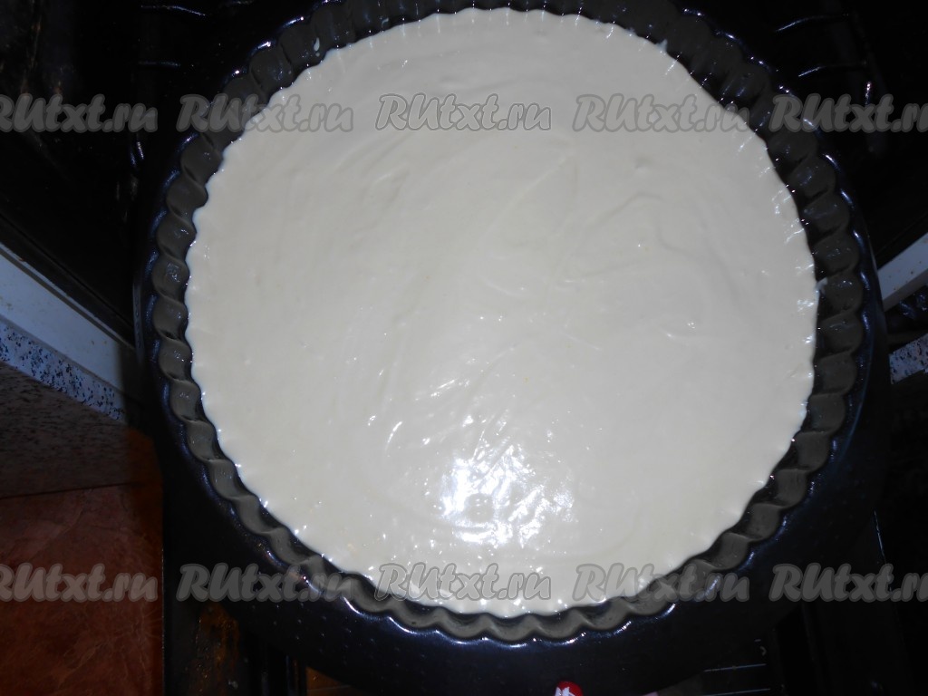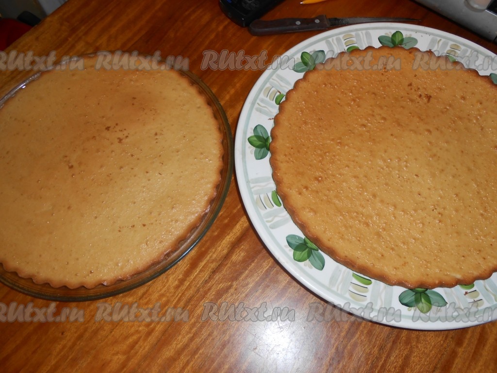 Берем форму для выпечки коржей, смазываем, наливаем часть теста и выпекаем в разогретой духовке до коричневой корочки.