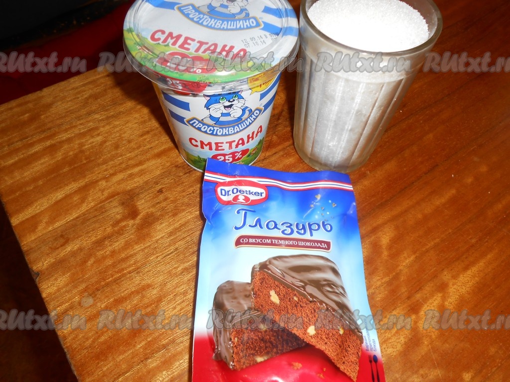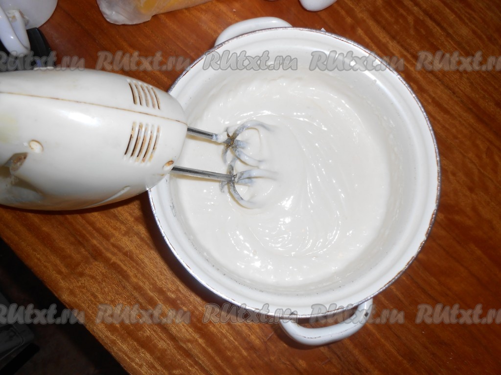 Для приготовления крема взбиваем сахарный песок со сметаной и убираем в холодильник часа на 2.