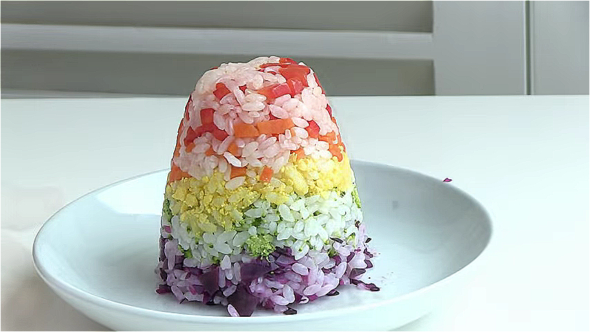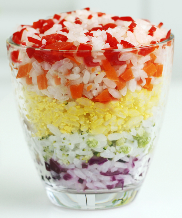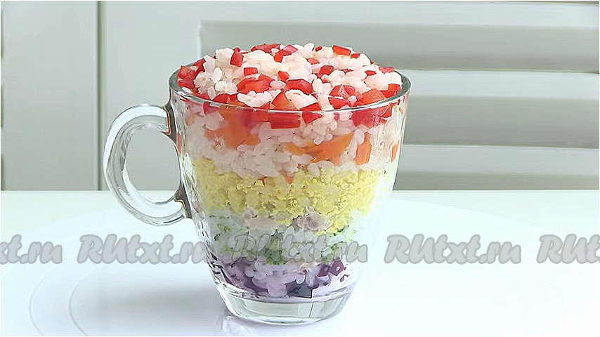 Выложить салат "Радуга" в прозрачную кружку или миску слоями, чередуя каждый слой разноцветного риса с тунцом.