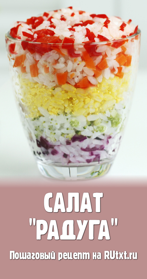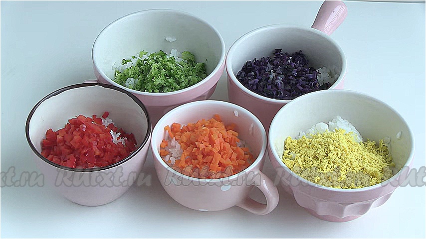 Перед подачей к столу перевернуть миску на тарелку и подавать салат красивой радужной горкой.