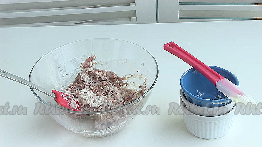 Тунец консервированный в собственном соку перемешать с мелко нарезанным луком, майонезом и поперчить по вкусу.